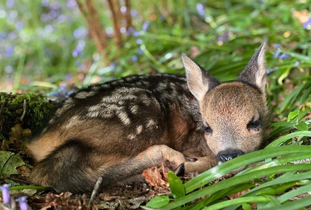 Roe deer calves hide in tall grass, camouflaged while their mothers graze nearby.